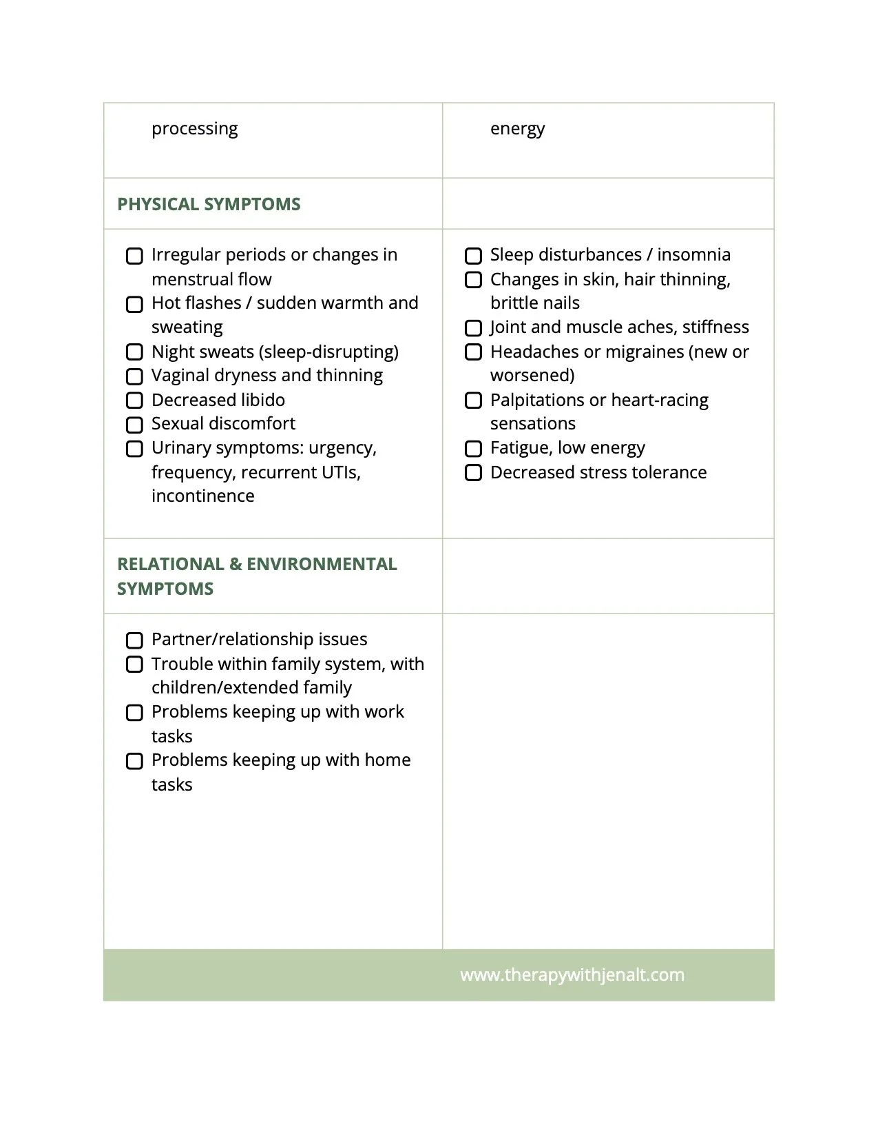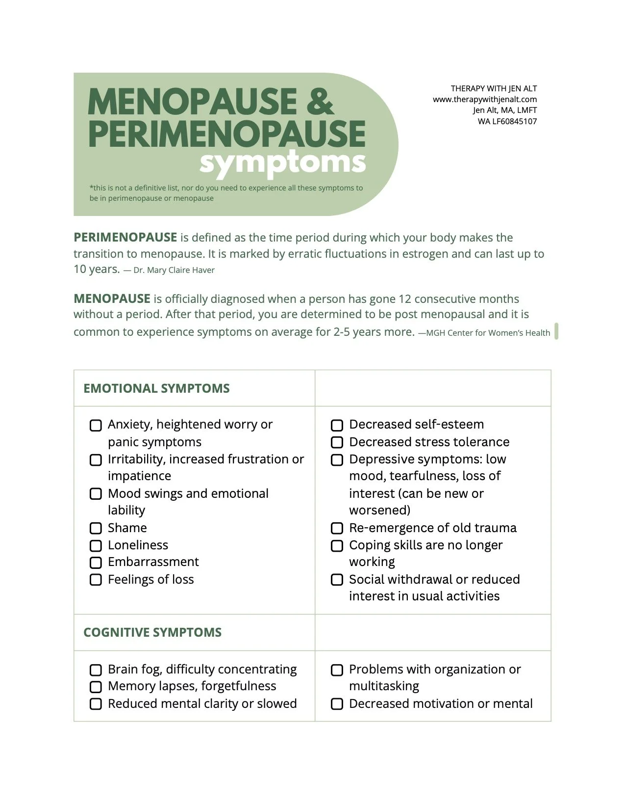While sources vary, perimenopause can last from 2 years to over a decade, and menopause signifies the cessation of your period for 12 consecutive months. That is a long time to feel the emotional rollercoaster and physical symptoms connected to the slowing and eventual end of your ovaries former mission in life. Even in the post-menopausal period you can feel the emotional and physiological symptoms connected to decreasing estrogen and other hormones. Seeking support is a sign of strength and 100% valid at this time of transformation and change.